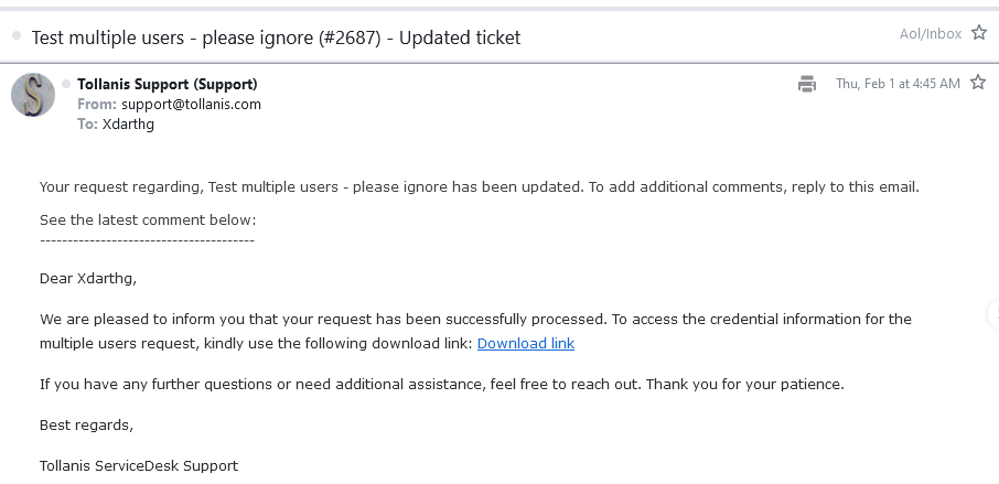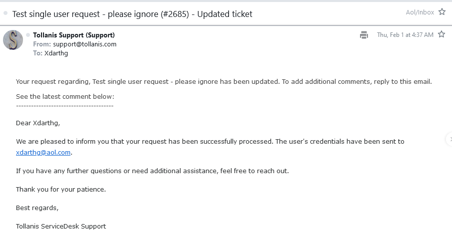 - If there are no issues with the newly created accounts (e.g., login problems), the agent will mark the ticket as Solved (you may refer to the article Tollanis Support Agent Workflow for the steps to close a ticket.)