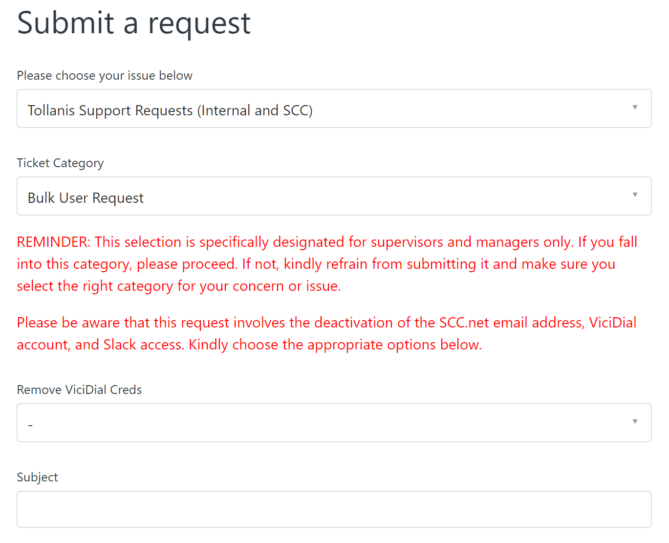 This article provides the steps to submit an offboarding request for a Smarter Call Center (SCC) user.