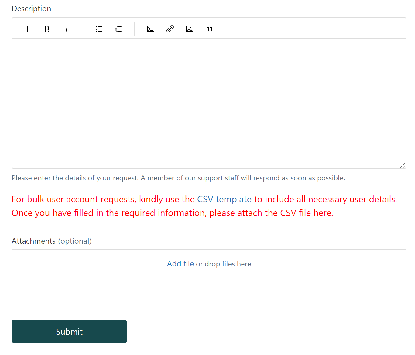 Bulk User RequestFor Bulk User Request, the CSV file containing the required user account data to be offboarded needs to be included in the request. Download and fill up the CSV template (the download link can be found below the Description section of the form.)