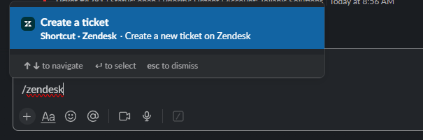 - In the message input box, type `/zendesk` and press Enter.